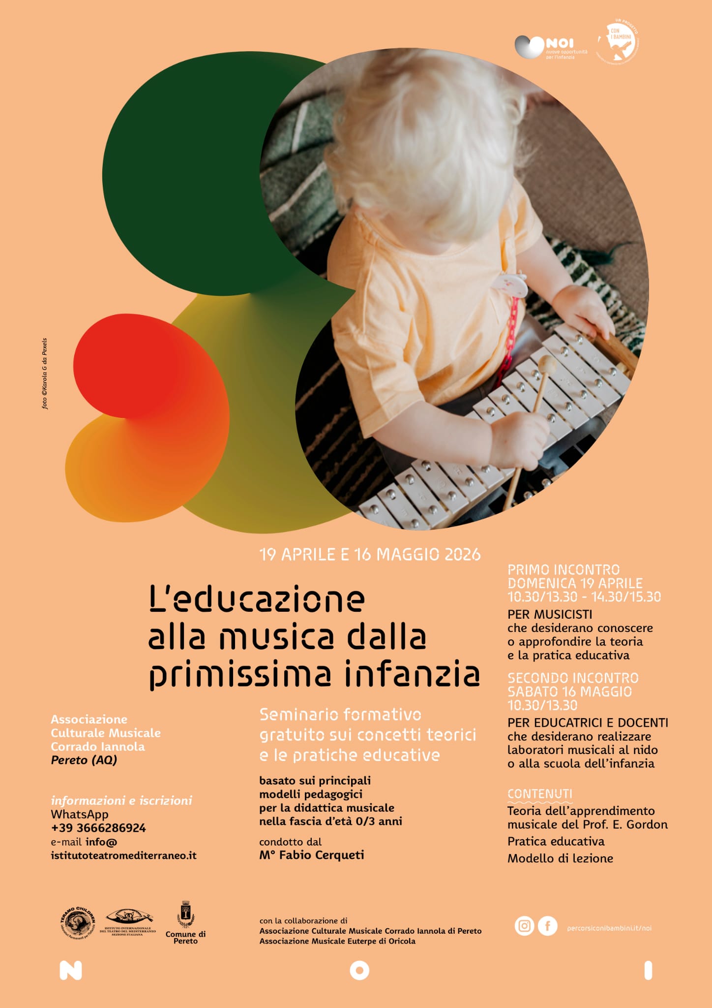L’Associazione Culturale Musicale Corrado Iannola di Pereto (AQ), in collaborazione con l’Associazione Musicale Euterpe di Oricola, promuove il seminario formativo gratuito “L’educazione alla musica dalla primissima infanzia”, in programma il 19 aprile e il 16 maggio 2026. L’iniziativa è pensata per approfondire i concetti teorici e le pratiche educative legate alla didattica musicale nella fascia d’età 0/3 anni, con un taglio rivolto sia alla formazione sia alla sperimentazione operativa.